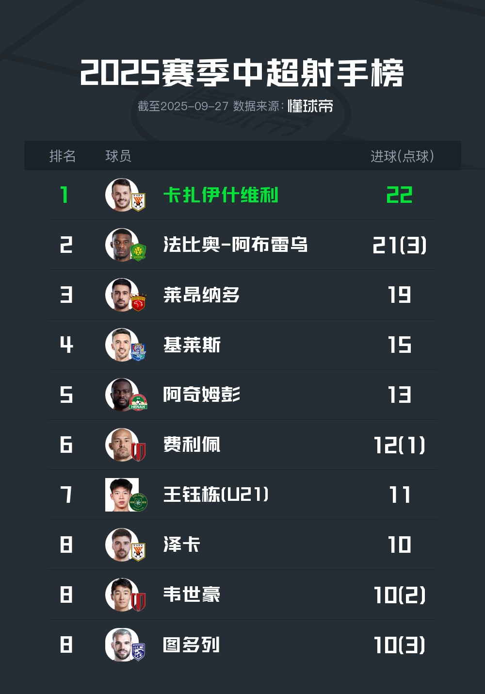 在山东泰山比赛延期的情况下,少赛一场的卡扎伊什维利以22球领跑射手榜,法比奥21球和莱昂纳多19球紧随其后。